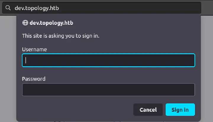 $ ffuf -w /usr/share/SecLists/Discovery/DNS/subdomains-top1million-5000.txt:FUZZ -u http://topology.htb/ -H 'Host: FUZZ.topology.htb' -fs 6767