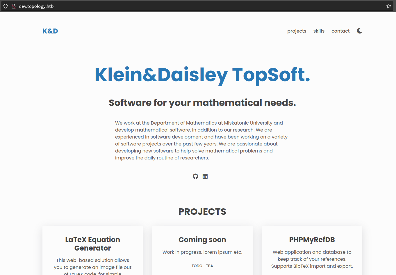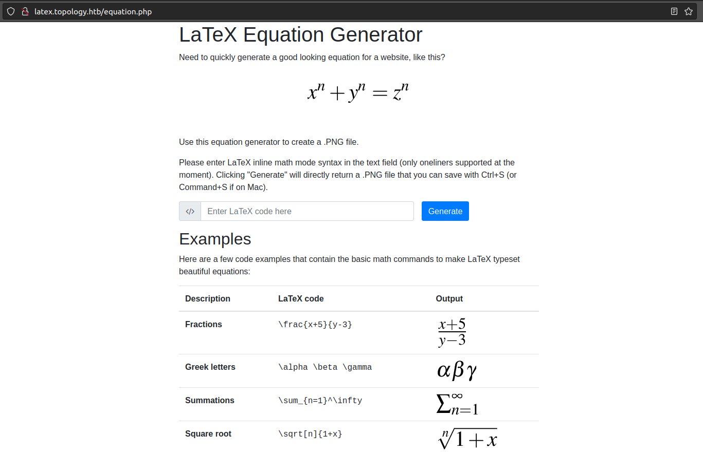 • <a href="http://latex.topology.htb/equation.php">LaTeX Equation Generator</a> - create .PNGs of LaTeX equations in your browser